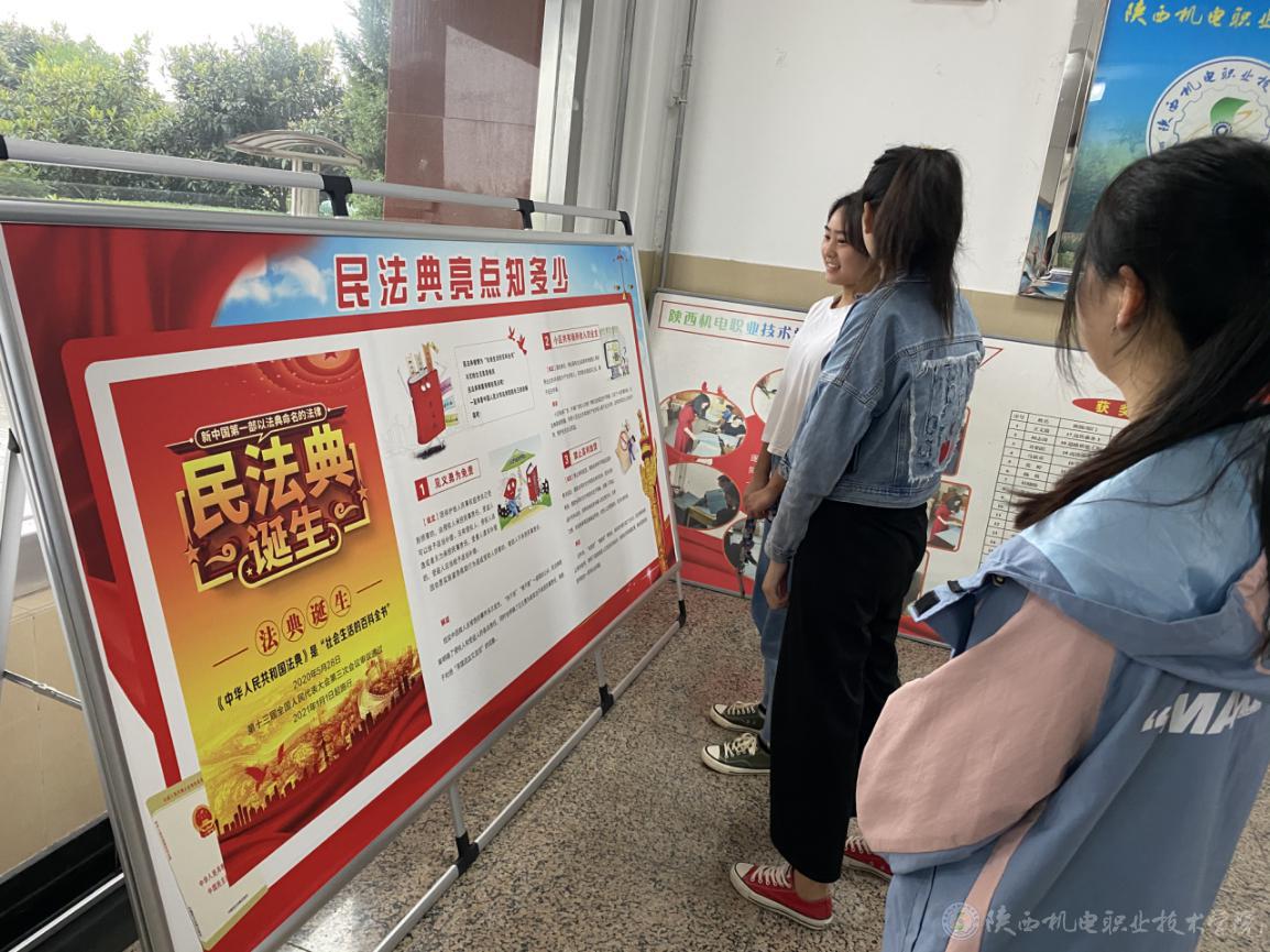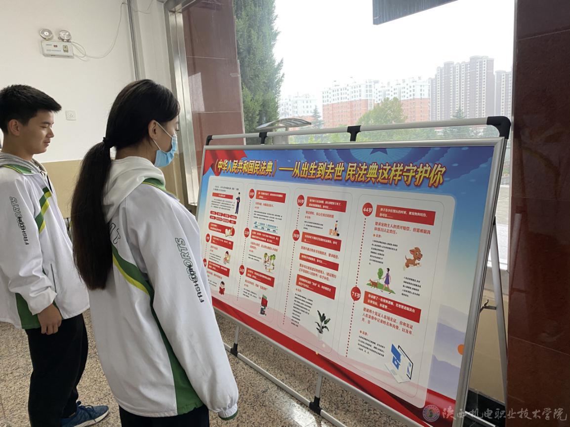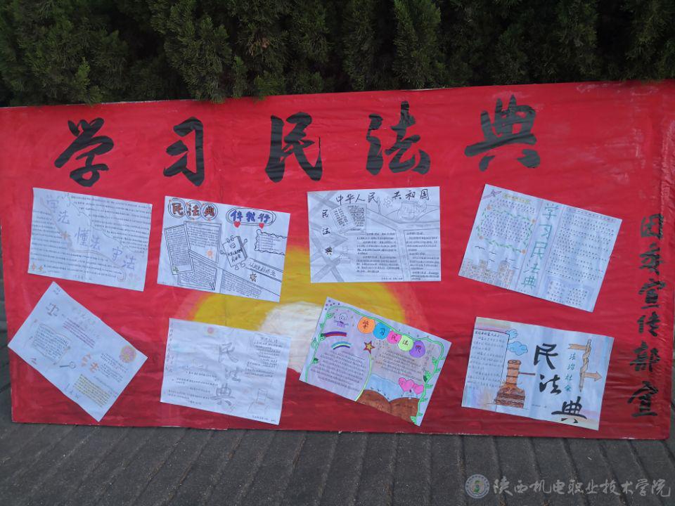校团委采取线上线下相结合的方式组织开展活动,线上在官网发布“民法典”相关知识和视频,在微信公众号、微信群发布民法典的相关文章,供师生阅读和观看,并在校内悬挂宣传横幅、张贴展板海报,让广大师生对民法典有初步了解。