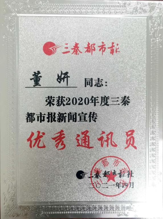 我校董妍老师荣获2020年三秦都市报“优秀通讯员”称号