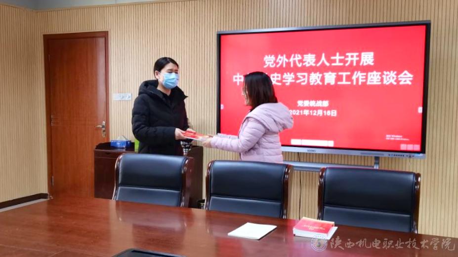 党委统战部为党外代表人士购买了《党的十九届六中全会<决议>学习辅导百问》《中国共产党第十九届中央委员会第六次全体会议公报》《中共中央关于党的百年奋斗重大成就和历史经验的决议》,曹丹凤老师为李小强老师、张琼老师发放学习资料。