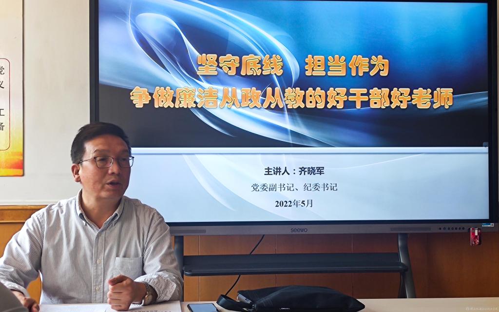 为进一步推进廉洁文化宣传教育走深做实,5月23日下午,校党委副书记、纪委书记齐晓军同志在宝福路校区建筑与经管楼202教室为基础部和经管与艺术学院党员教师讲授了题为《坚守底线 担当作为——争做廉洁从政从教的好干部好老师》的专题党课。经管与艺术学院全体无课党员、教师参加。