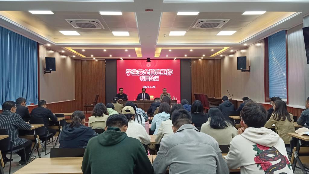 我校学生安全稳定工作专题会议于4月26日上午在蟠龙校区博学楼会议室召开,党委书记伊逊智出席,保卫处副处长常小凯、学工系统科级以上干部、全体专职辅导员、新疆派驻教师参加,会议由学生处处长王建斌主持。