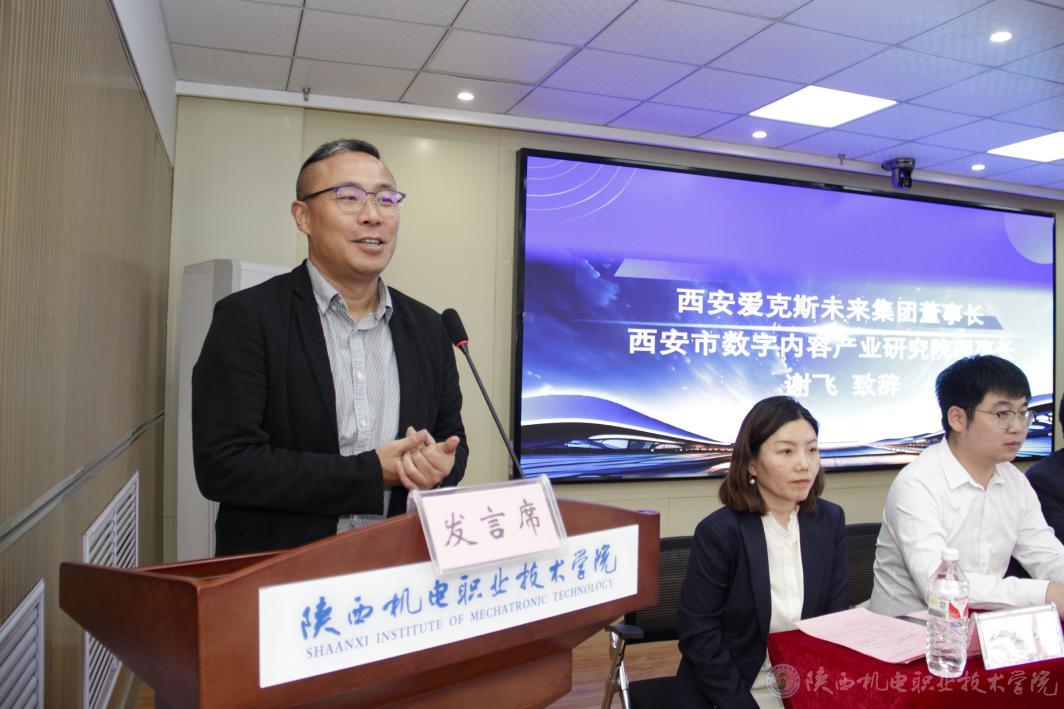 西安爱克斯未来集团董事长谢飞在致辞中详细介绍了西安市未来数字内容产业研究院的相关情况。他指出,当前产业正面临人才供需失衡的挑战,行业对高素质专业人才的需求尤为迫切。同时表示,集团高度重视与我校的合作,将在人才培养、专业建设、技术服务以及创新创业等领域展开深度协同,通过资源共享与机制创新,实现“人才共育、成果共享”,共同推动数字内容产业的高质量发展。