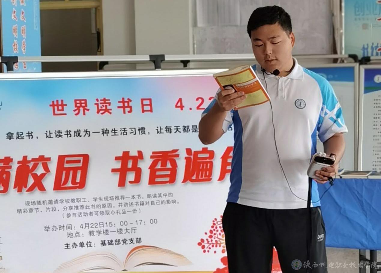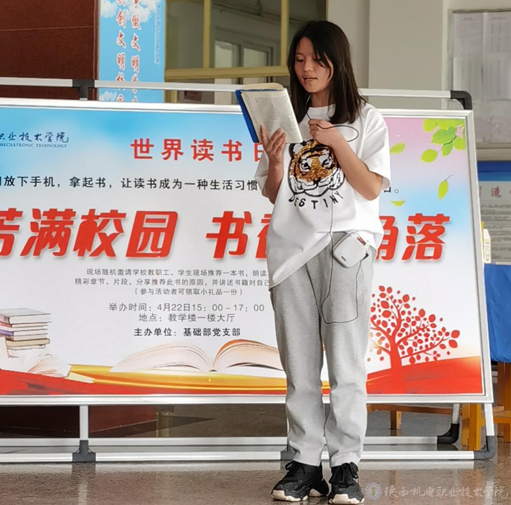 下午三点宝福路校区第一教学楼大厅,同学们带着自己喜欢的书籍来到现场有序参加活动,随着基础部党支部书记满春燕的宣布,活动正式开始。党支部成员严把疫情关,严查佩戴口罩,保持一米距离。同学们介绍书的主要内容并阐述推荐理由,还把特别喜欢的章节或者段落朗读给在场的每一个人听,声情并茂,颇具感染力。